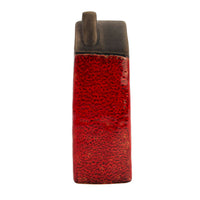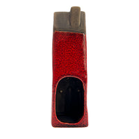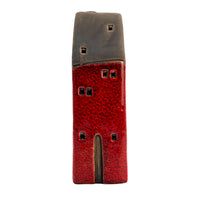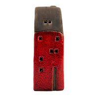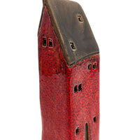 • Side angle of the Brackenwood Manor red ceramic tealight house with dark roof and textured red glaze finish.