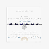 See your little birthday babe shine bright on their special day with our twinkling Kids' Birthstone A Littles - a sweet assortment of beaded bracelets, threaded with semi-precious gemstones to represent each birth month! Featuring gorgeous Lapis Lazuli gemstones, a sparkling silver-plated disc charm, and a poem straight from the heart, our Kids' A Little 'September' Birthstone Bracelet In Silver Plating will make the perfect addition to their little wrist stack.