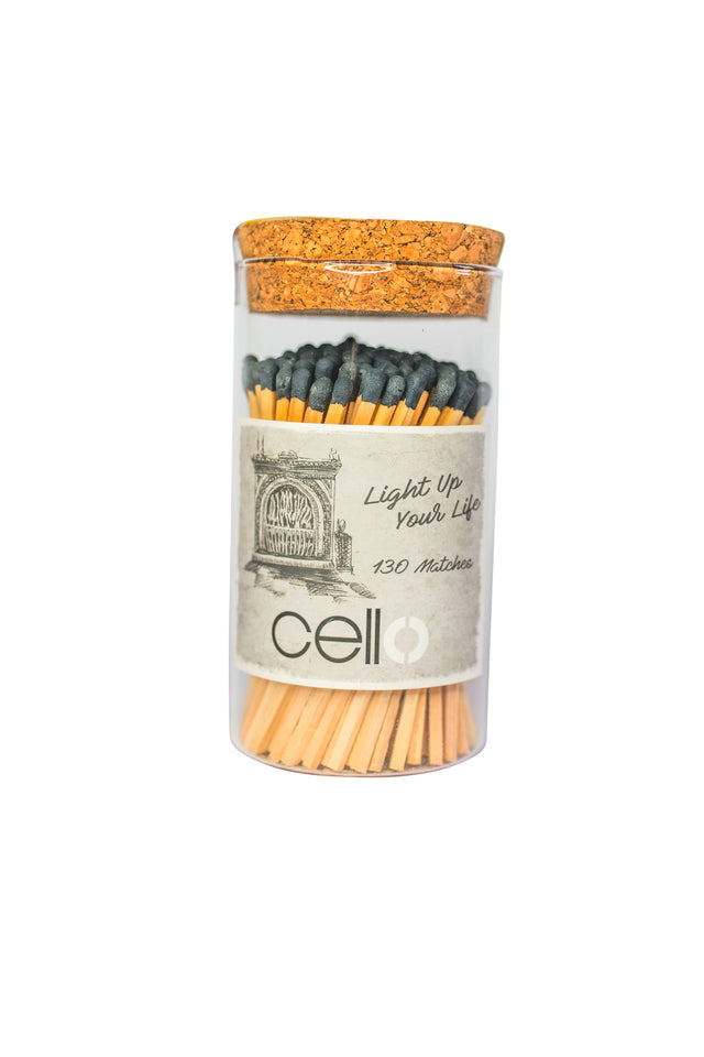 130 wooden matches with black heads in a glass container with a cork lid. Perfect for summer and lighting BBQs as well as colder months and lighting candles! These matches combine functionality with a touch of elegance, making them an ideal choice for both practical and aesthetic reasons. Cello Matches are designed to ignite easily and burn consistently, ensuring a reliable flame every time you strike them.