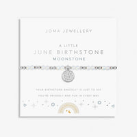 See your little birthday babe shine bright on their special day with our twinkling Kids' Birthstone A Littles - a sweet assortment of beaded bracelets, threaded with semi-precious gemstones to represent each birth month! Featuring gorgeous moonstone gemstones, a sparkling silver-plated disc charm, and a poem straight from the heart, our Kids' A Little 'June' Birthstone Bracelet In Silver Plating will make the perfect addition to their little wrist stack.