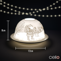 Cello porcelain tealight holder dome, in our Father Christmas design. This design displays father Christmas with his sack in the North Pole ready to deliver presents. We offer a wide...