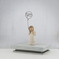 Willow Tree Figurine in Miss You. This beautiful hand crafted figurine depicts a young girl holding a balloon with the words miss you. A perfect gift for an absent loved one or a way to express your love and care in a unique way.
