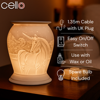 These Electric Wax Warmers work in harmony with Cello scented wax melts or medallions to create a relaxing and calming atmosphere. With no need for flames, you can sit back and enjoy the slow release of your favourite fragrance, while the exquisite design shines through the porcelain creating a gorgeous soft glow.