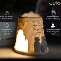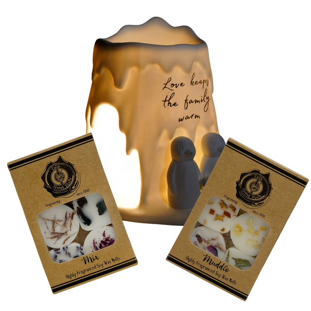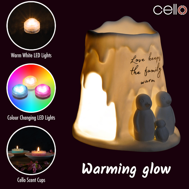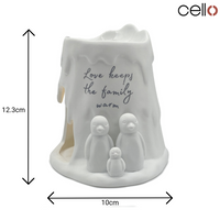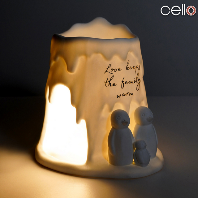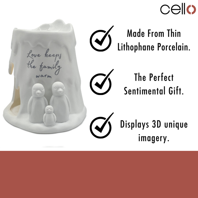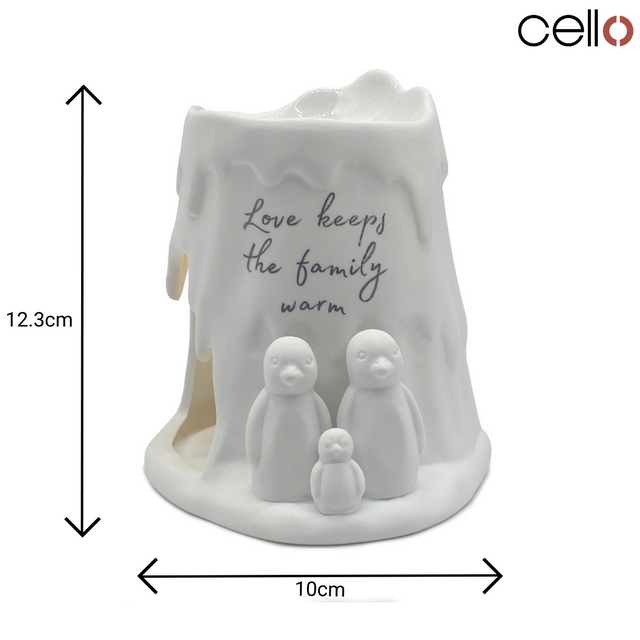 Celebrate the warmth of family with the Cello Family Porcelain Penguin Tealight Burner & 12 Naked Melts Set. Featuring an intricately sculpted porcelain design, this charming burner showcases a heartfelt scene of penguins huddled together, symbolising love, unity, and togetherness. The inscription "Love Keeps The Family Warm" adds a sentimental touch to this already beautiful piece.