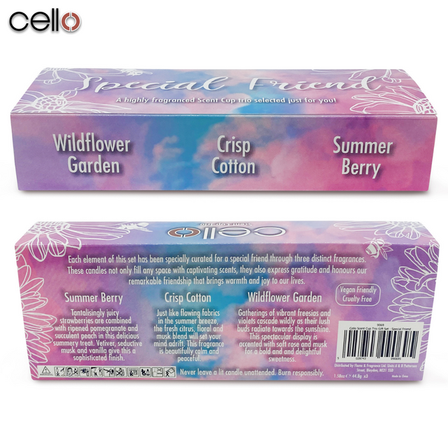 These Cello Scent Cup Trios include 3 different fragrances: Wildflower Garden, Crisp Cotton, and Summer Berry. The 'Special Friend' Trio makes the ideal, unique gift for friends on any occasion,...