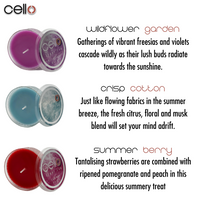 These Cello Scent Cup Trios include 3 different fragrances: Wildflower Garden, Crisp Cotton, and Summer Berry. The 'Special Friend' Trio makes the ideal, unique gift for friends on any occasion, including Birthdays and Christmas!