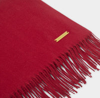 Wrap yourself in comfort with our Blanket Scarf in Garnet Red, crafted from ultra-soft material to keep you cosy year-round. Featuring stylish frayed edges and a luxurious gold-tone logo bar, this oversized scarf adds a touch of elegance to any outfit. Whether you're treating yourself or gifting it to someone special, it's the perfect blend of warmth and style.