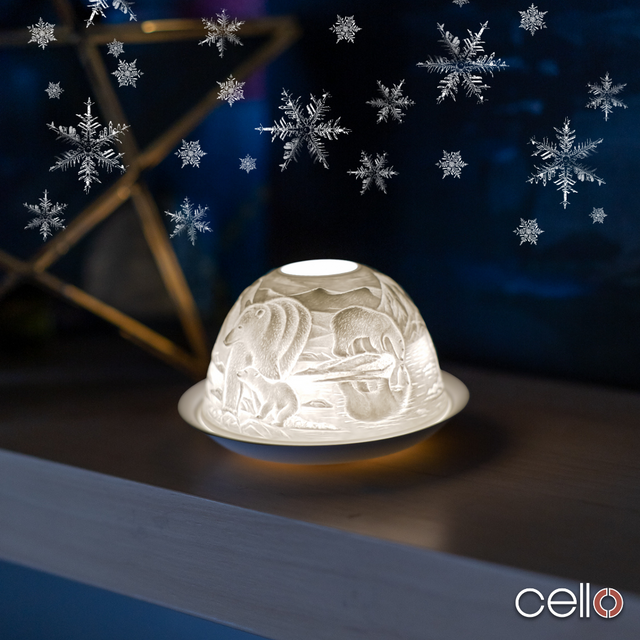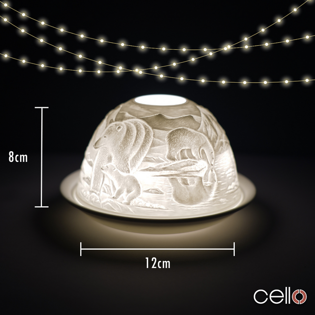 Cello porcelain tealight holder dome, in our polar bear design. This design displays an image of polar bears in their natural habitat. We offer a wide range of porcelain tealight holders to let you choose your show-stopping piece and show it off with pride when guests and family are over.