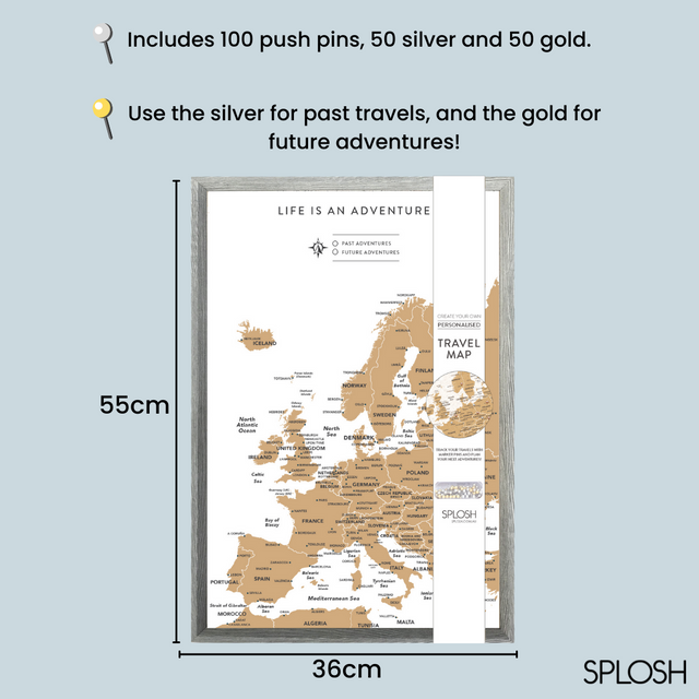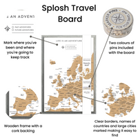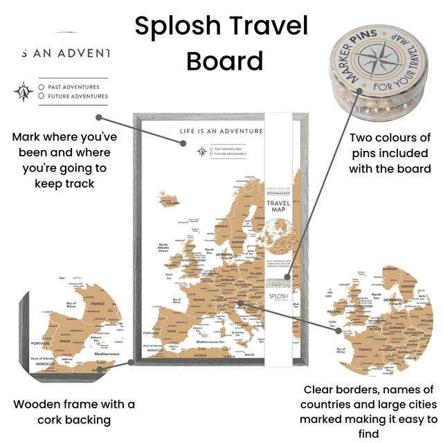 Hang it in an area of pride and make it the focal point of any room to remind yourself of the fun times and use it as a unique talking point with family and friends. Our Splosh travel map range now comes in three different colours and with numerous maps and sizes. Your adventures can start now, choose your map today.