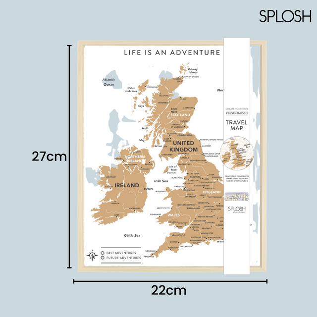 • Splosh Travel Map – UK Desk Map with White Frame and Gold Land Detail. Designed for desk use with a sturdy leg for support and anti-slip material. Perfect for tracking travels across the UK with push pins, featuring Life is an Adventure text. Ideal for home or office decor.
