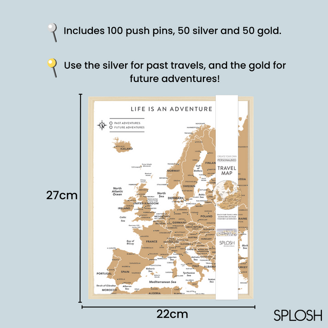 Hang it in a place of pride and make it the focal point of any room to remind yourself of the fun times and use it as a unique talking point with family and friends. Our Splosh travel map range now comes in three different colours and with numerous maps and sizes. Your adventures can start now, choose your map today.