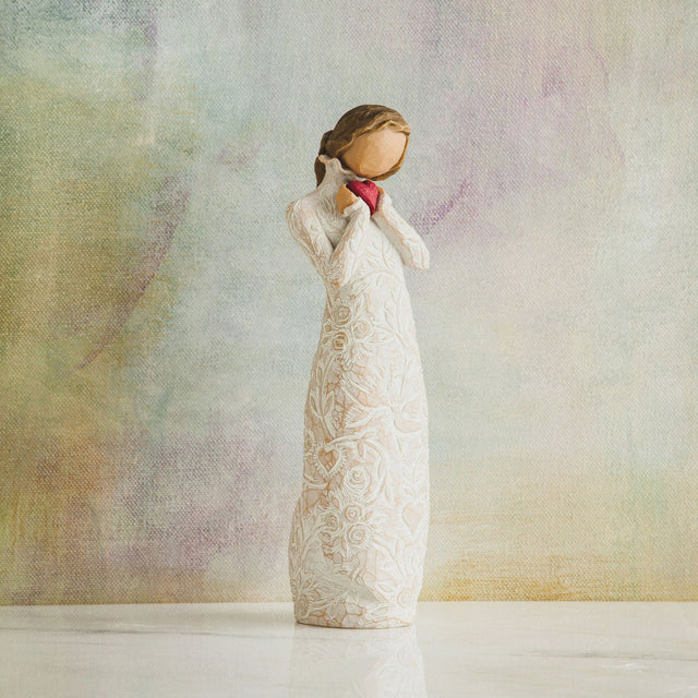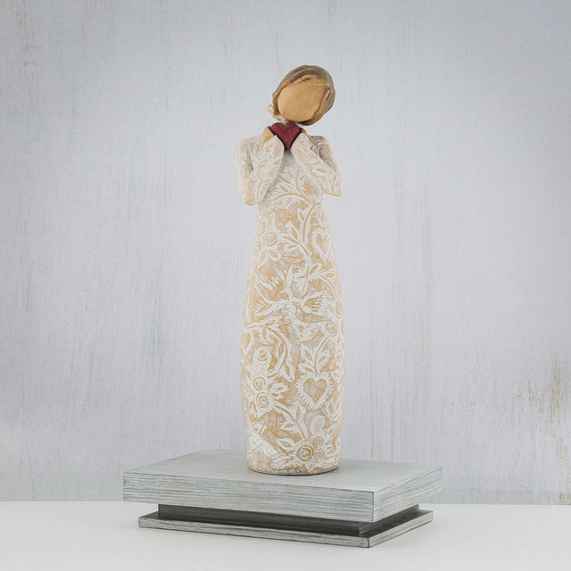- Standing figure in cream dress with ruffled neck, holding red heart in hands; dress extensively carved with hearts, flowers and birds